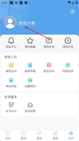 2、在个人信息页面点击顶部的注册登录,进入登录界面。