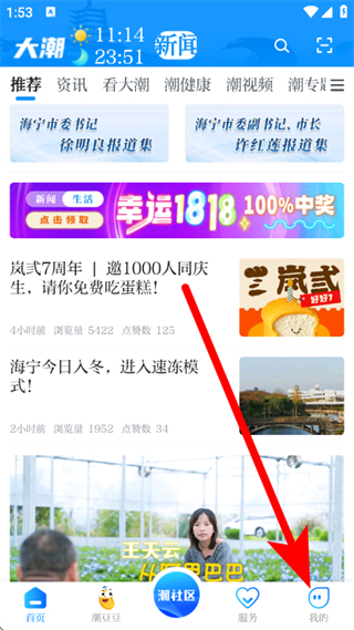 1、打开海宁大潮网,点击底部我的,进入我的页面。