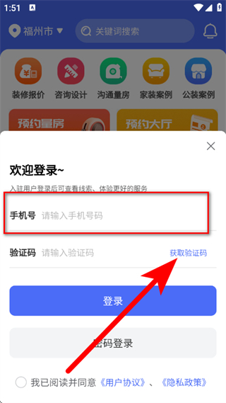3、在登录注册页面,输入手机号后,点击获取验证码。