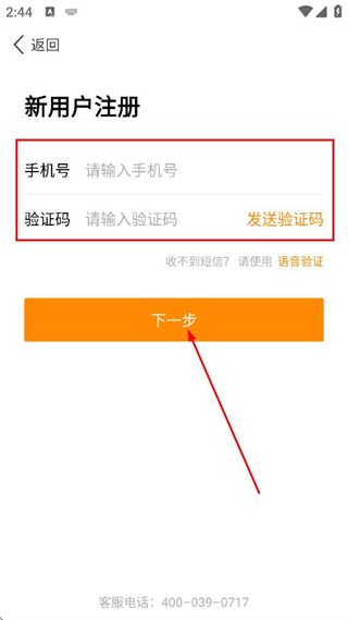 4、输入手机号验证码,点击下一步,完成账号注册操作。