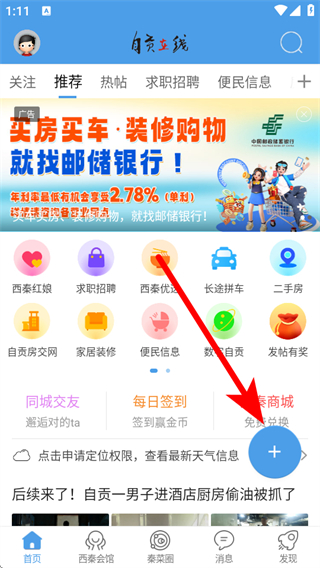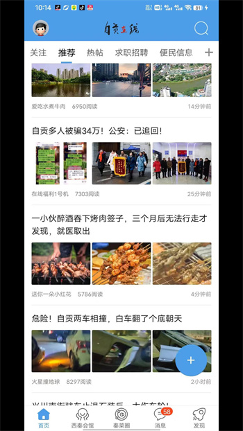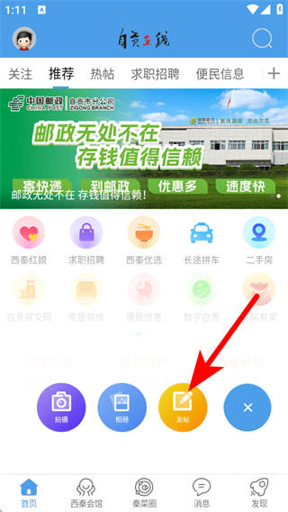 1、打开自贡在线APP,点击右下角发现的加号按钮,展开功能选项。
