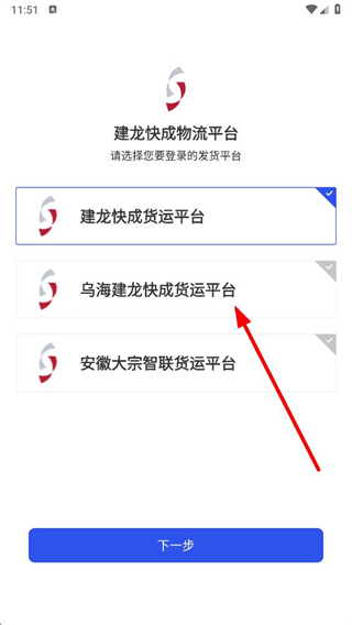 1、在平台选择界面,根据需求选择对应的货运平台,如乌海建龙快成货运平台,点击下一步。
