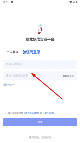 4、在验证码登录界面,输入手机号,点击获取验证码,收到后输入短信验证码,勾选同意协议后点击登录。