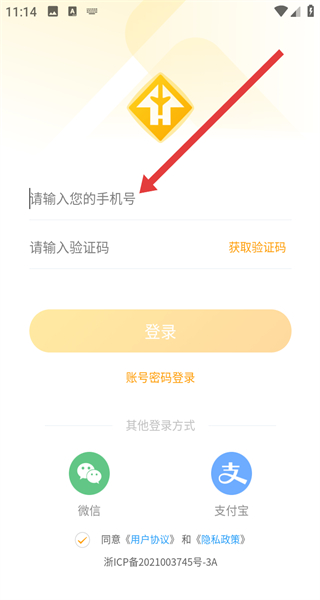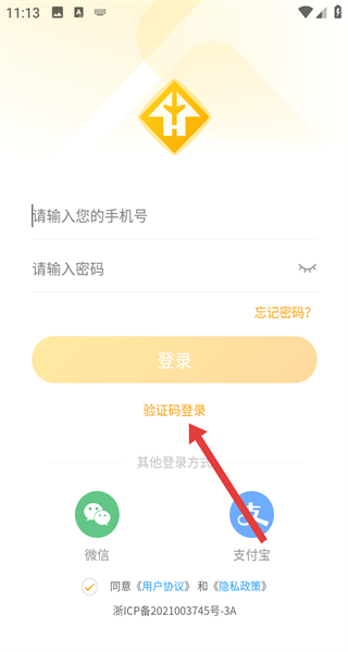 3、在登录界面,选择验证码登录方式,输入手机号码。