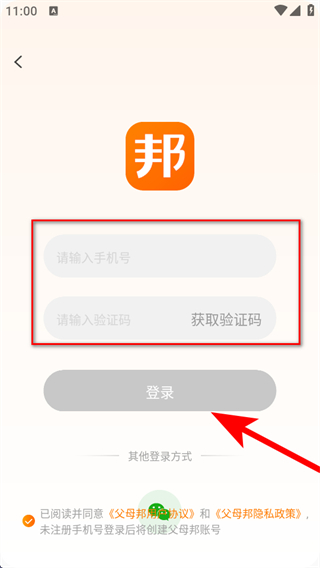 3、在登录注册界面,输入手机号码和验证码后,点击登录完成注册。
