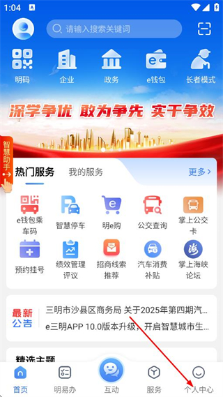 2、在e三明首页,点击底部个人中心,进入个人中心页面。