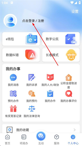 3、在个人中心页面,点击点击登录/注册,进入登录页面。