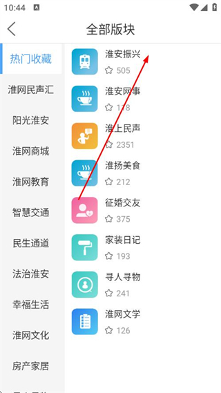 1、打开淮水安澜APP,点击首页的全部版块选项,进入版块选择页面。