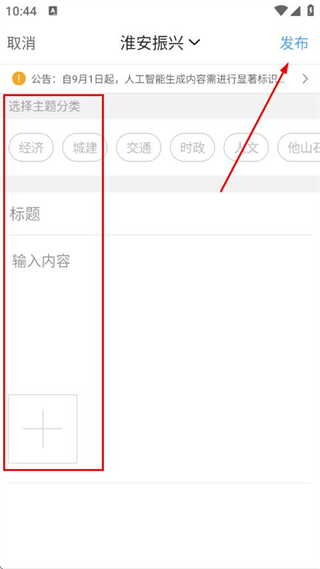 3、选择主题分类,输入标题和内容,添加图片后,点击发布。