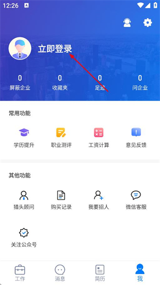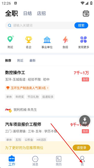1、在求职APP工作页面,点击底部我,进入个人页面。