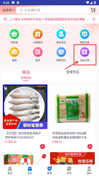 2、在超市购物页面,点击全部分类选项,进入商品分类页面。