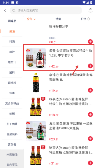 3、在商品分类页面,选择海天头道酱油零添加特级生抽1.28L条目,进入商品详情页。