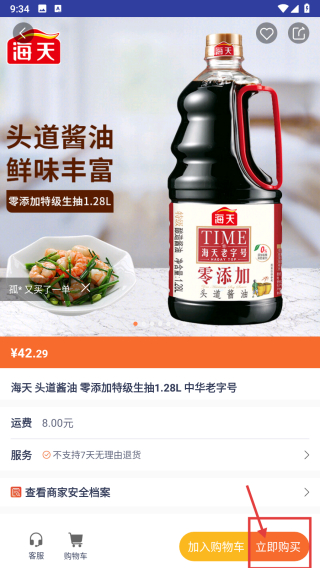 4、在商品详情页,点击立即购买按钮,进行该款酱油的购买操作。