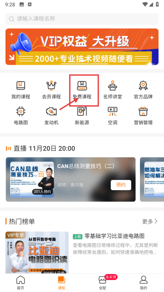 2、在课程页面,点击免费课程选项,进入免费课程列表页。