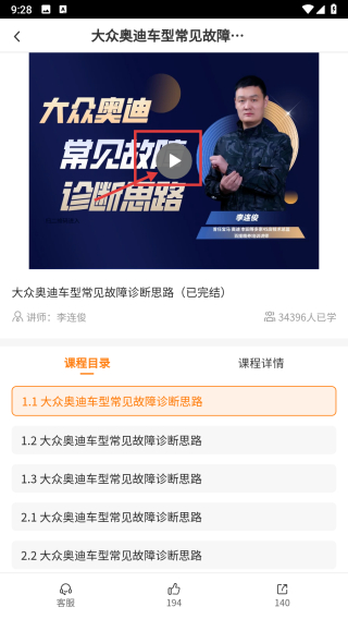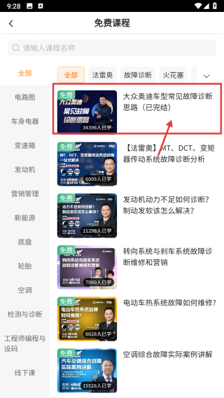 3、在免费课程列表里,选择大众奥迪车型常见故障诊断思路条目,进入课程详情页。