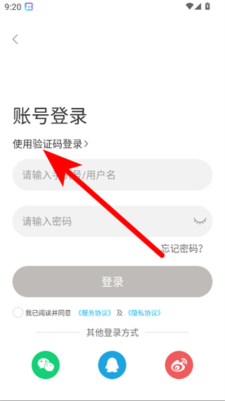 2、在账号登录界面,点击使用验证码登录选项,进入手机号登录/注册页面。
