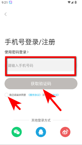 3、在手机号登录/注册页面,输入手机号码,勾选同意协议后点击获取验证码即可。