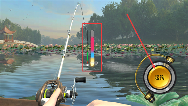 2、鱼咬钩后会出现力度条,此时需关注力度变化,在合适时机点击起钩按钮,确保成功钩住鱼。