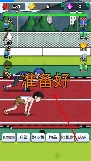 3、在竞赛准备界面等待片刻,即可进入赛跑场景,需通过点击屏幕等操作提升跑步速度。