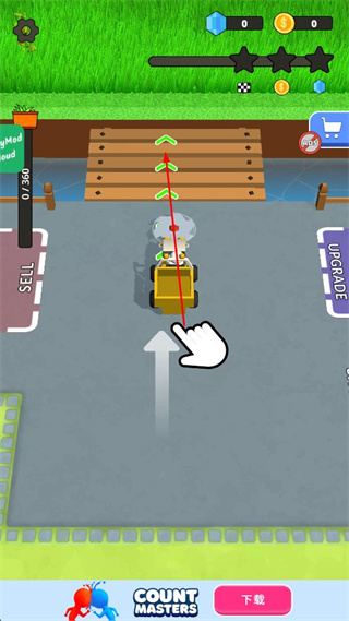 1、控制黄色车辆沿箭头指示向上移动,穿过木板区域,此时钻石和金币数量均为0,顶部显示三颗黑色星星。
