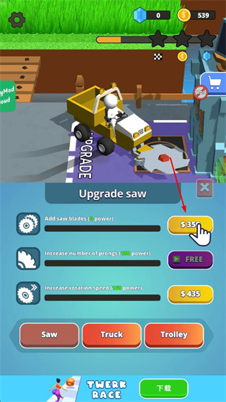 3、金币积累至539时,点击升级界面中Addsawblades对应的350金币按钮,提升锯片能力,其他升级项暂不操作。