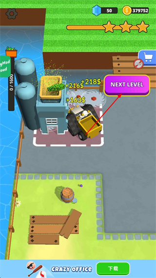 4、完成当前关卡获得218+216+163金币,钻石50,点击紫色NEXTLEVEL按钮,进入下一关游戏。