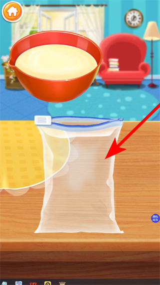 4、将搅拌好的混合物倒入袋子中,完成史莱姆冰淇淋的初步制作,为后续的冷冻、成型等步骤奠定基础,通过这一系列操作体验流程。
