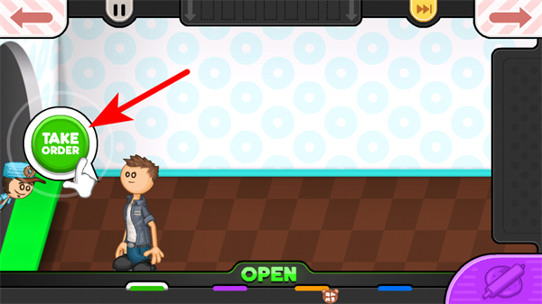2、在经营场景中,点击TAKE ORDER接收顾客的订单,这是开展经营的第一步,通过接收订单明确需要制作的甜甜圈类型,推进经营流程。