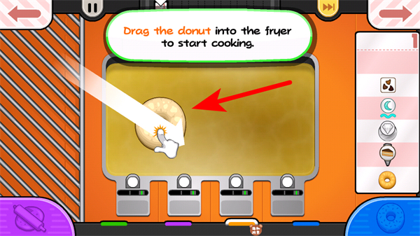 4、擀平面团后,将制作好的甜甜圈拖动到炸锅中开始烹饪,按照提示完成炸制操作,这是甜甜圈制作的关键环节,通过炸制使甜甜圈成型。