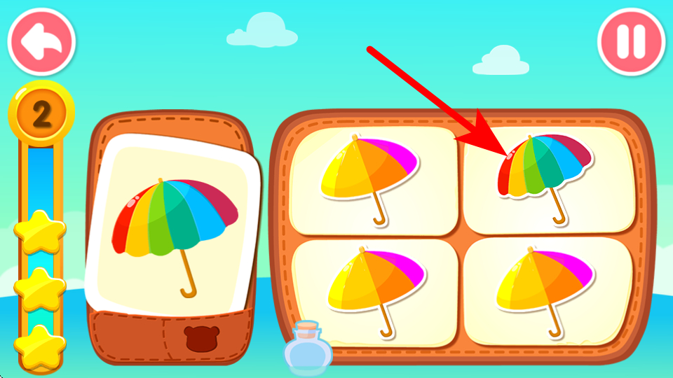 3、继续观察左侧新的目标图案如彩色雨伞,在右侧图案区域找到与之完全相同的雨伞并点击,逐步完成多轮配对,锻炼对物品特征的辨别能力。