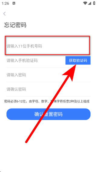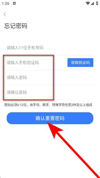 4、输入手机验证码,设置密码并确认密码后,点击确认重置密码,完成操作。