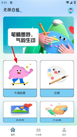 1、在无限白板首页,点击卡通临摹选项,可进入卡通临摹页面。