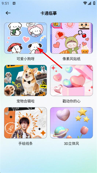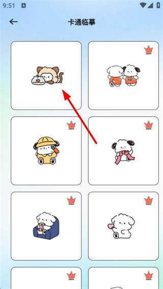 2、进入卡通临摹页面后,点击可爱小狗呀分类,可查看对应卡通素材。