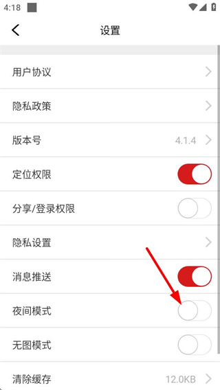 3、在设置界面中,点击夜间模式对应的开关按钮,可打开夜间模式。
