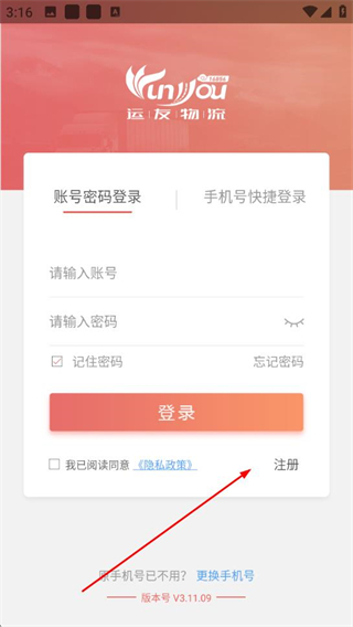 1、打开168运友物流APP,在登录界面点击注册,进入注册流程。