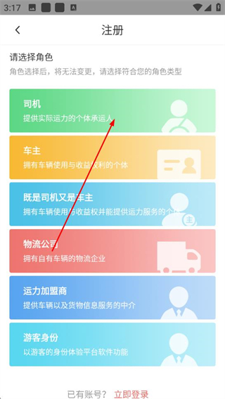 2、在注册页面选择角色,例如司机。