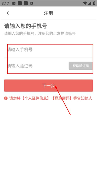 3、输入手机号,获取并输入验证码,点击下一步。