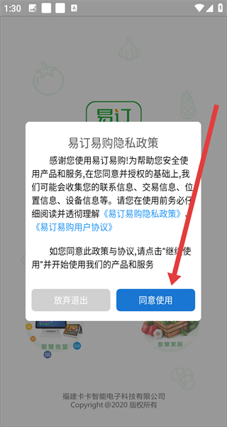 1、打开易订易购APP,点击同意使用按钮,确认隐私政策和用户协议,进入登录界面。