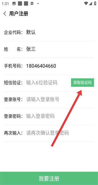 3、在用户注册界面,填写企业代码、姓名、手机号码后,点击获取验证码,输入收到的短信验证码。