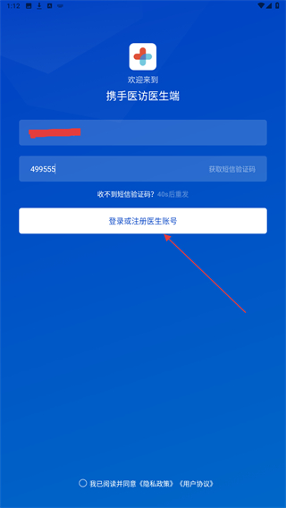 1、打开携手医访APP,进入时输入手机号并点击获取验证码。