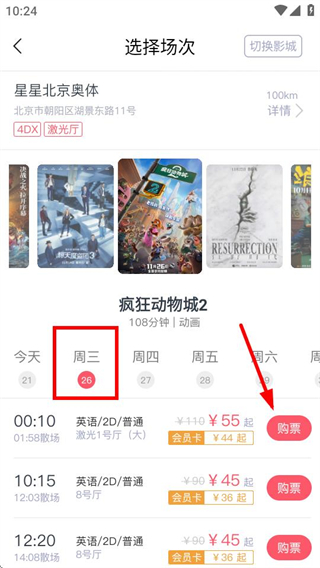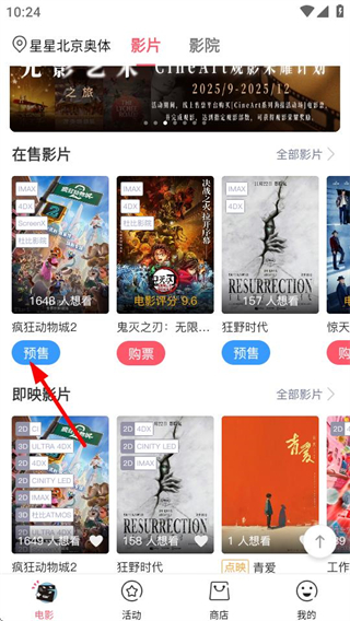 1、在电影页面,点击目标影片的预售按钮,进入选择场次页面。