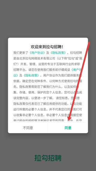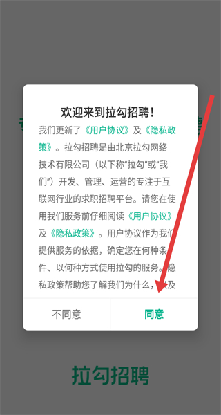 1、打开拉勾招聘APP,在弹出的用户协议及隐私政策提示框中,点击同意按钮。