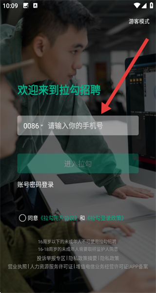 1、在打开拉勾网招聘app后,点击弹窗中的同意按钮后,进入使用。