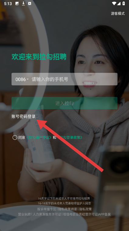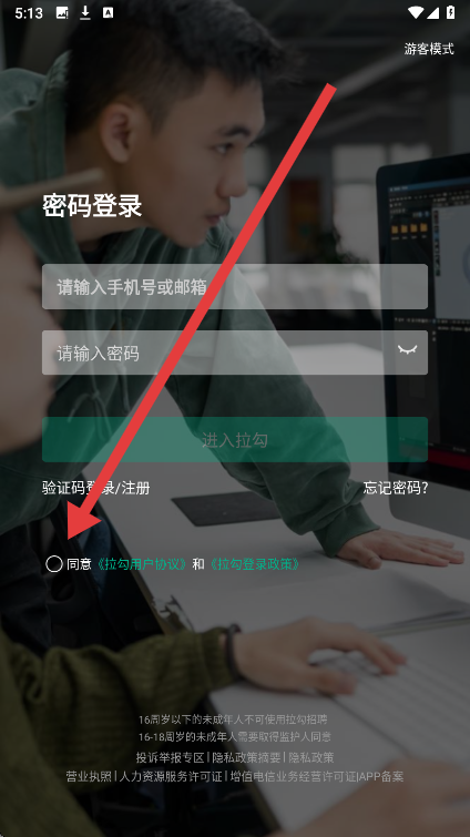 3、切换登录方式后,阅读完协议后点击勾选同意按钮。