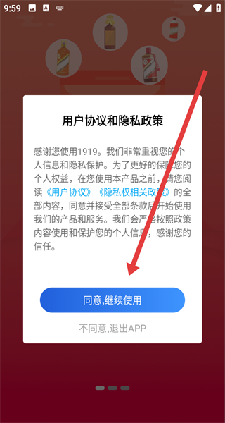 1、打开1919APP,点击同意,继续使用按钮,确认用户协议和隐私政策,进入主界面。