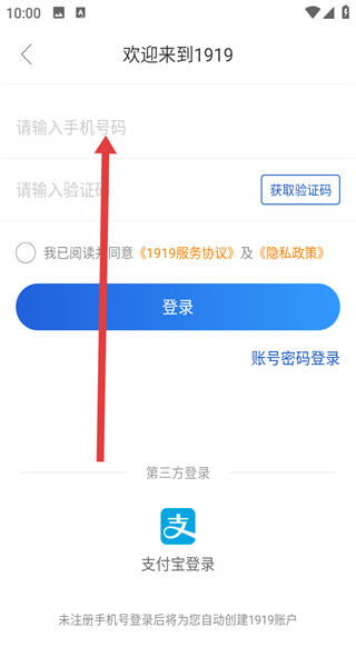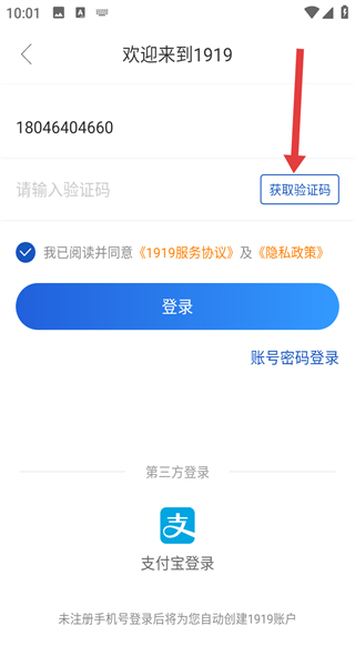 4、点击获取验证码并输入后,点击登录按钮,将自动创建1919账户,完成注册操作。