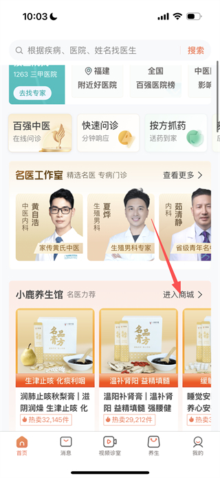 1、在小鹿中医首页,点击进入商城选项,进入小鹿养生商城页面。