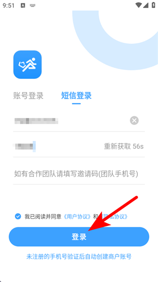 3、输入验证码并勾选协议后点击登录,完成快跑者账号注册操作。