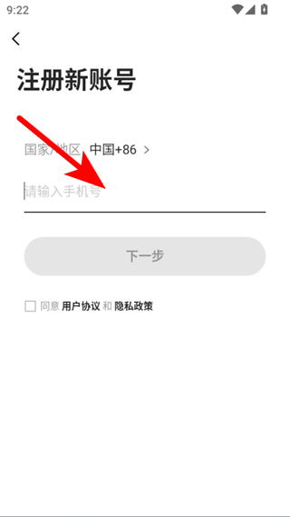 2、在注册新账号页面,输入手机号,勾选同意用户协议和隐私政策后,点击下一步。