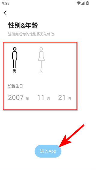 5、选择性别并设置生日,点击进入App,即可完成邵武在线的注册登录。